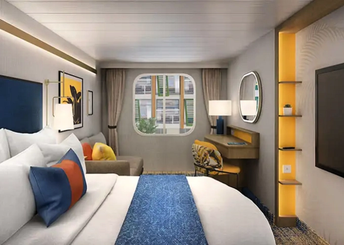 T5 - Vnútorná kajuta s oknom / Surfside Family 17 m². Neotvárateľné okno s výhľadom na štvrť Surfside. 8. paluba vpredu. Max 4 osoby. 4 776 € 1 194 € za osobu