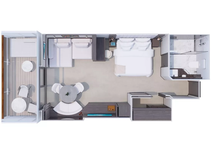 Ocean Suites - Ocean Grand Terrace Suite Suita 28 m² + kúpeľňa 4 m² + terasa so sedením a pohovkou 11 m². 6/7. paluba. Spálňa s obývacou časťou, šatník. Minibar, kávovar, vodná kanvica, ďalekohľad, sejf, kúpeľňa so sprchou. Fľaša šampanského na privítanie. 6, 7. paluba. Maximálna kapacita 2 dospelé osoby + 1 dieťa do nedovŕšených 18 rokov. 21 580 € 10 790 € za osobu